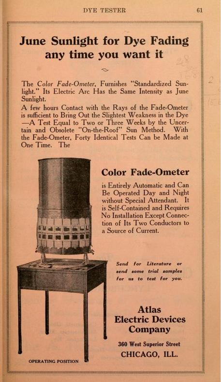Atlas在1915年开发了基于碳弧灯的光老化仪,并在1919年重新命名为Color Fade-Ometer®,从而开创了染色纺织品的实验室耐光色牢度试验。 自此,Atlas仪器不断改进光源,在1927年加入了耐候老化测试能力。Atlas Ci系列Fade-Ometer和Weather-Ometer、